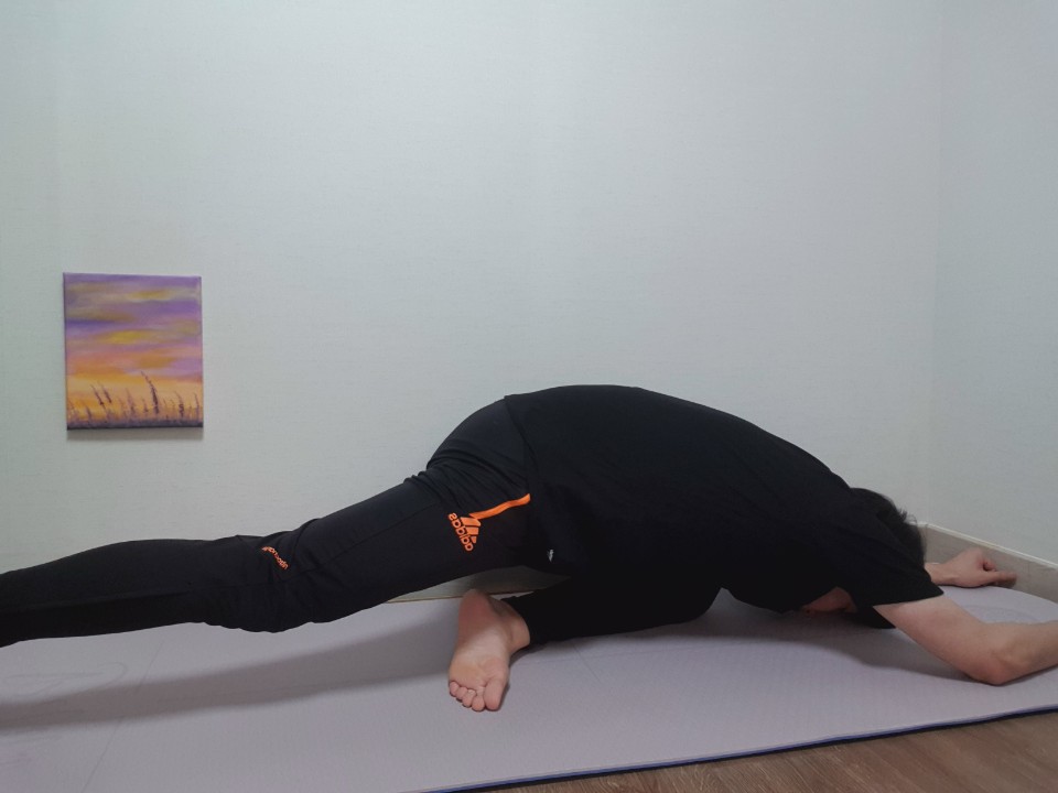 이번에는 한쪽 다리를 접어서 무릎 끝과 가슴이 만나게끔 끝까지 숙여줍니다