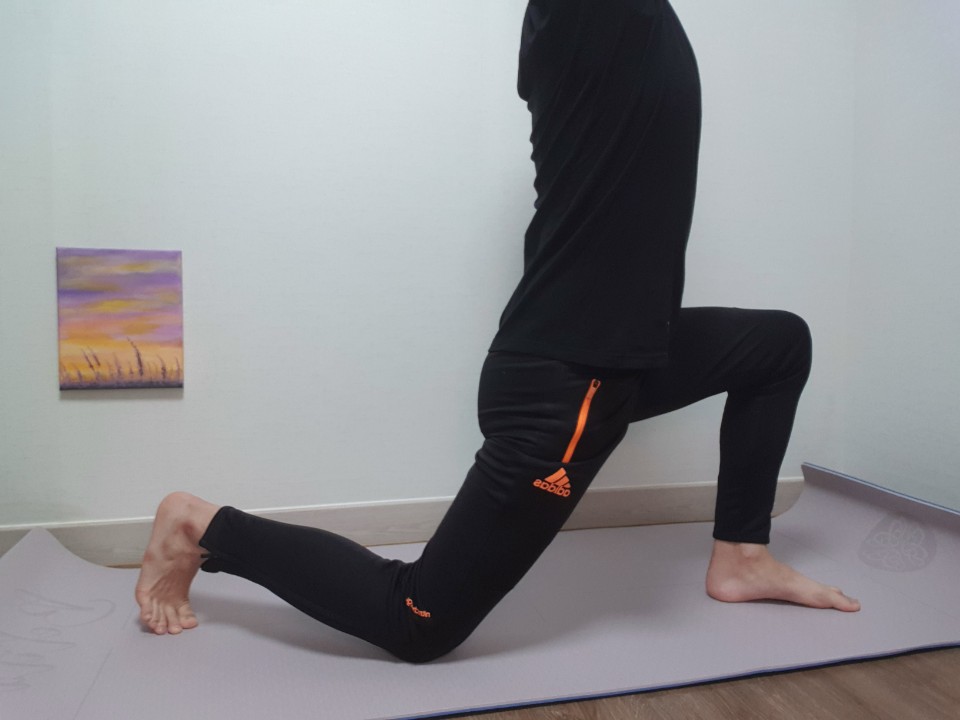 앞 무릎을 구부리면서 앞으로 나갈 때 고관절 부위가 더 땡기는 느낌이 들거예요